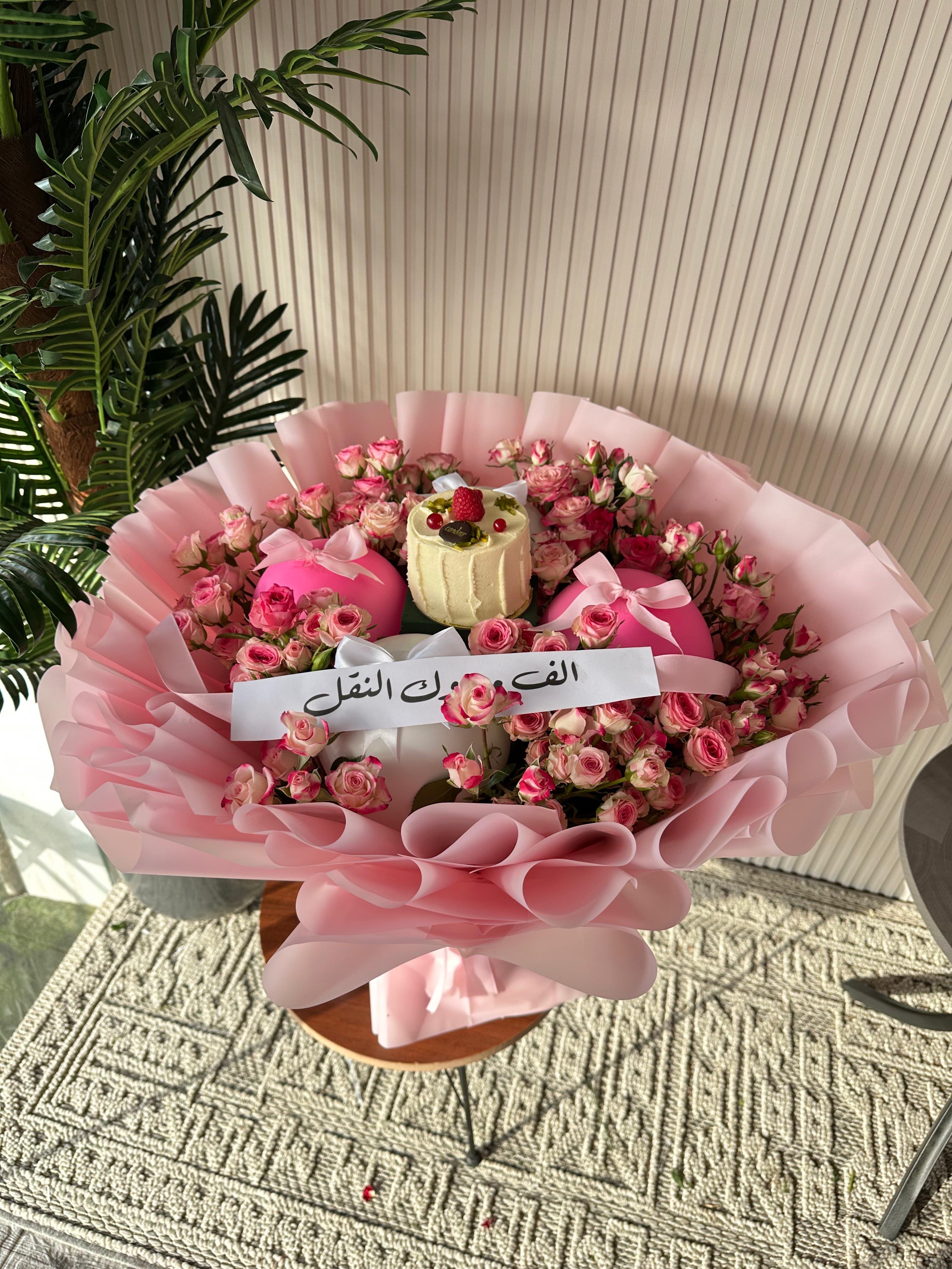 بكج الفرح الوردي: ورد وردي، بالون مليء بالبهجة، وكيك لذيذ لإسعاد من تحب في لحظة واحدة💕